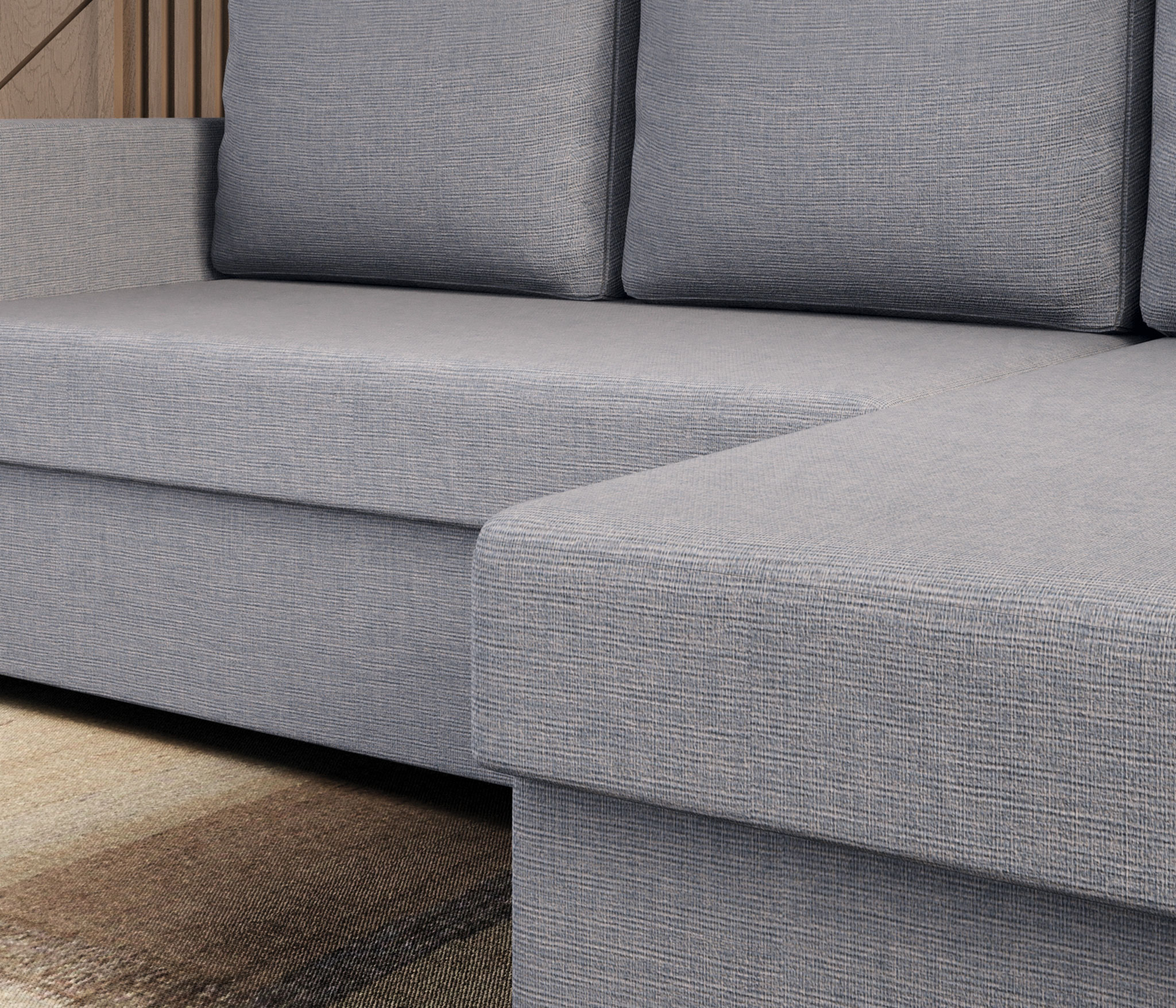 Каркас дивана «Джессика» выполнен из бруса и высокопрочной ЛДСП – ламинированной древесно-стружечной плиты, надежно удерживающей крепежные элементы.Мягкие части модели созданы на основе современного материала ППУ (пенополиуритана), полученного из синтетических полимеров и обработанного антигрибковым и антибактериальным составами. Материал долговечен, экологически безопасен, быстро восстанавливается после смятия, не плесневеет, не впитывает и не выделяет пыль. Обивка из рогожки приятна на ощупь, устойчива к разрывам и истиранию, не мнется, не растягивается и легко чистится.Простоту эксплуатации этого дивана обеспечивает выкатной механизм «Дельфин», позволяющий двумя движениями создать ровное и упругое спальное место размером 1400 х 1900 мм – достаточно выкатить вперед основание, а в освободившуюся нишу опустить спинку. Поэтому можно купить угловой диван «Джесика» для ежедневного пользования, а лаконичный дизайн и нейтральная цветовая гамма снимают ограничения при выборе дополнительных элементов интерьера – журнального столика, кресел, стеллажей и элементов декора.