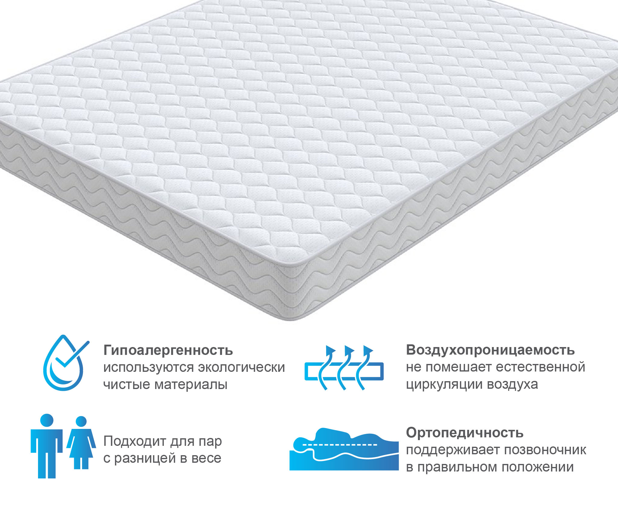 В основе матраса Спринг лежит классический пружинный блок Bonnell, который служит надежной опорой для позвоночника. Наполнитель из эластичного долговечного пенного материала делает матрас комфортным для сна и отдыха. Изолирующий слой из термовойлока придает дополнительную жесткость, а так же за счет своей объемной структуры способствует лучшей циркуляции воздуха.