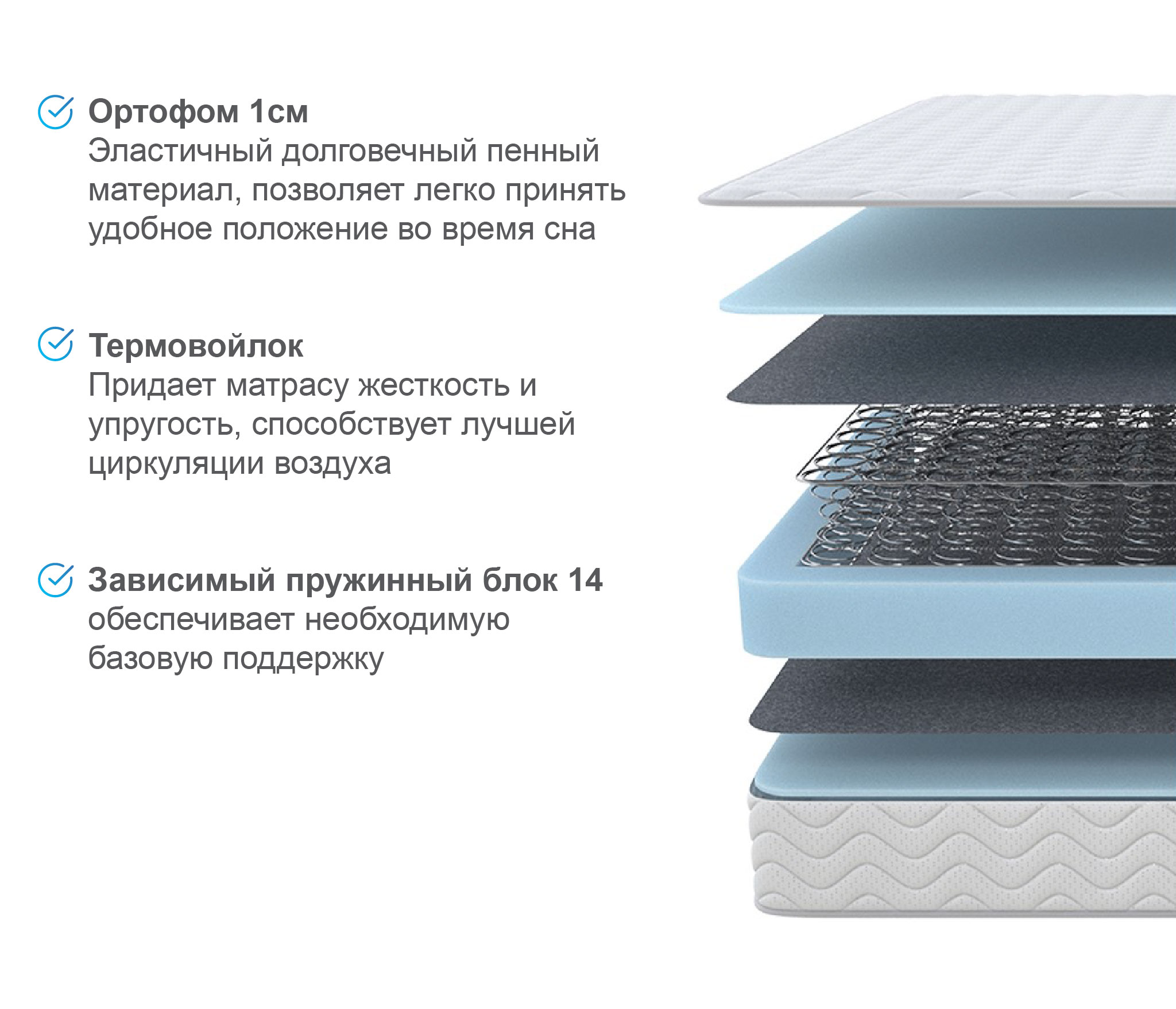 В основе матраса Спринг лежит классический пружинный блок Bonnell, который служит надежной опорой для позвоночника. Наполнитель из эластичного долговечного пенного материала делает матрас комфортным для сна и отдыха. Изолирующий слой из термовойлока придает дополнительную жесткость, а так же за счет своей объемной структуры способствует лучшей циркуляции воздуха.