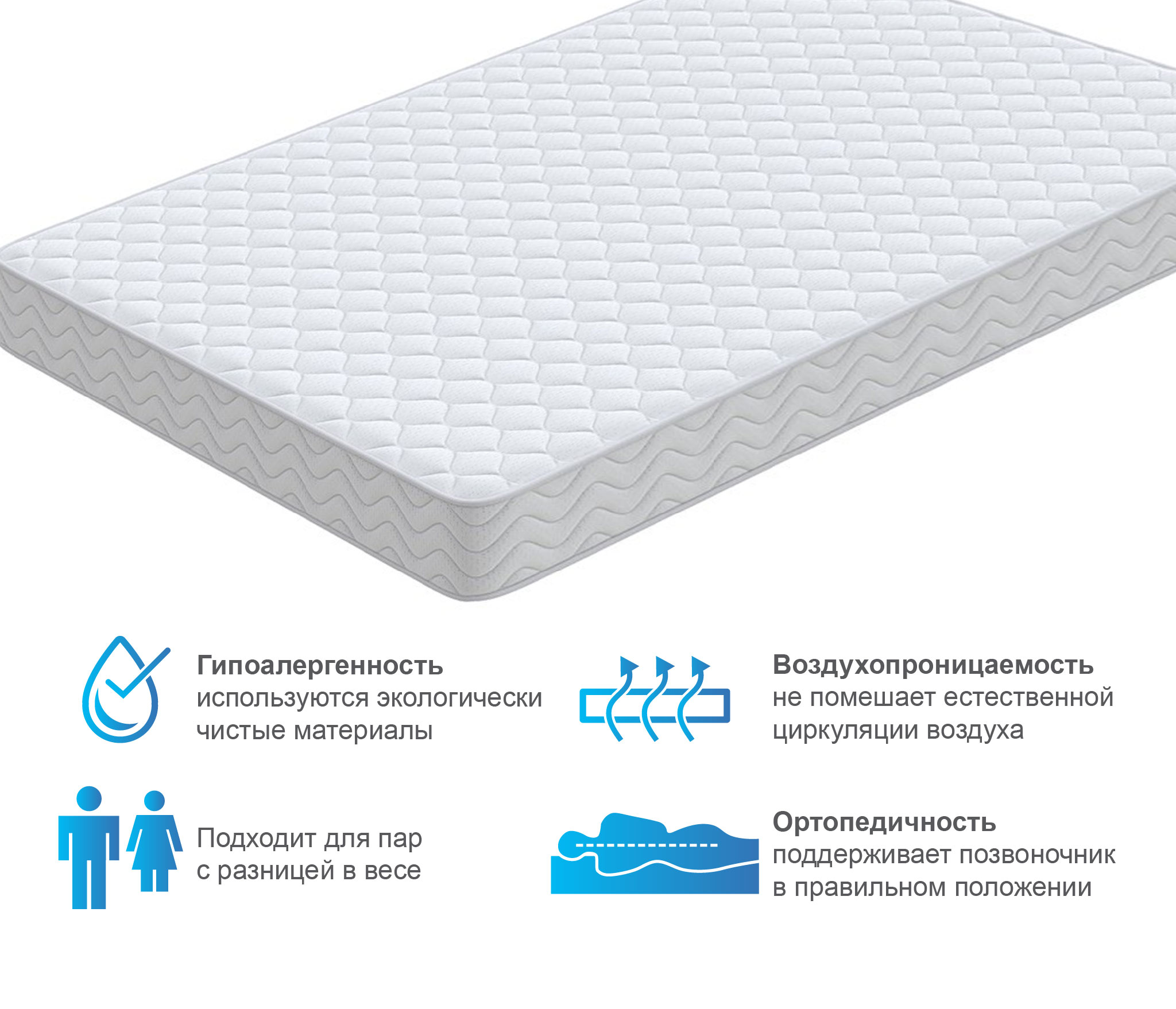 Основой служит зависимый пружинный блок Боннель. В нем все конусные стальные пружинки (126/м2) соединены между собой и скреплены при помощи специальной рамы. Изделие способно выдерживать высокие нагрузки. Над блоком в 1см расположена латексированная кокосовая койра. Это покрытие на основе жестких кокосовых волокон, но смягченных натуральным латексом. Наполнитель улучшит осанку, поддержит корсет из мышечной ткани.